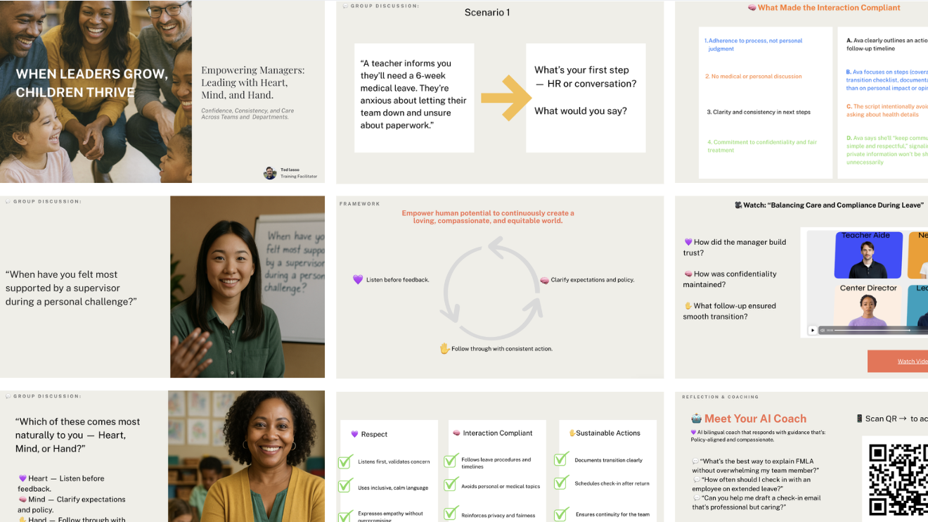 A leadership training experience for mid-level managers focused on supporting employees on medical leave with empathy and compliance through effective communication and documentation. The program used a scenario-based approach grounded in the Heart–Mind–Hand framework, combining guided discussions, shared communication language, and role-play practice. It was delivered through a blend of presentations, video scenarios, interactive activities, and an AI coaching tool to reinforce real-world application.